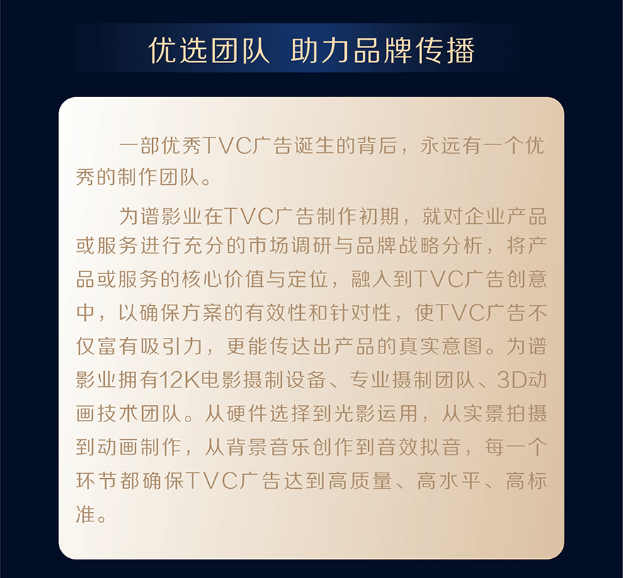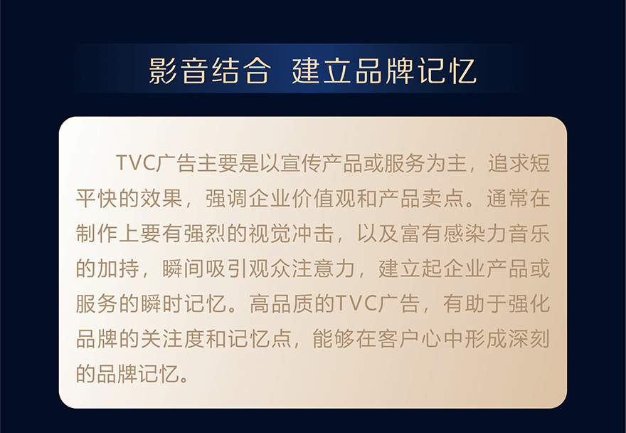 宣传片是制作电视、电影的表现手法,是品牌与受众沟通的桥梁。讲述故事,传递声音,用宣传片的力量,点亮品牌的璀璨光芒!