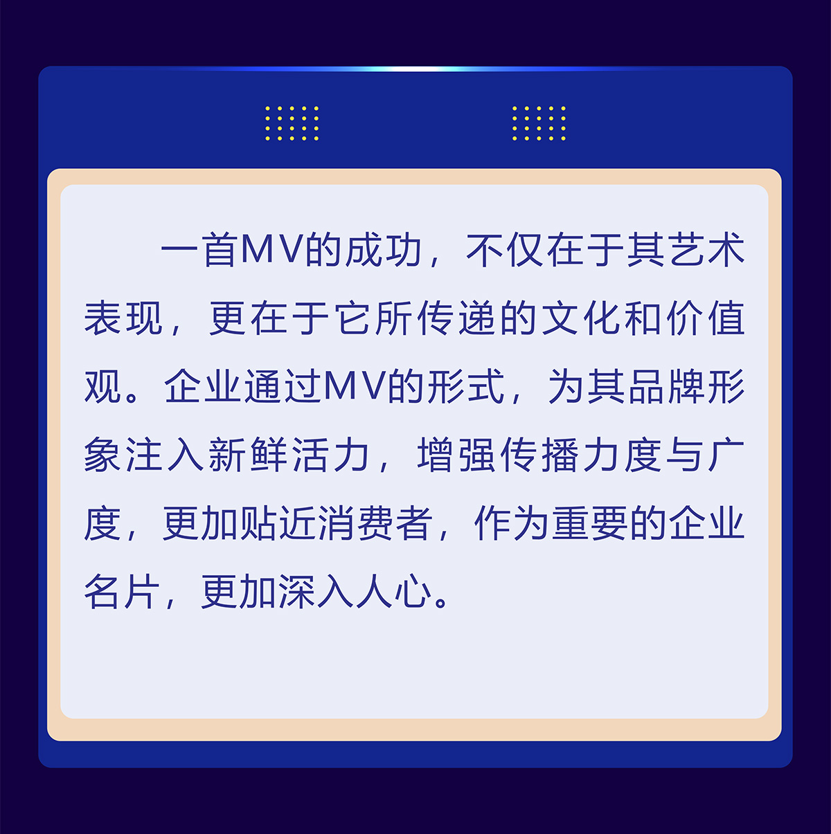 MV,流动的视觉,为企业品牌形象注入新鲜活力,增强传播力度与广度,作为重要的企业名片,更加深入人心。